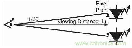 一套LED顯示系統(tǒng)包含大量的LED燈和一個(gè)大電源。設(shè)計(jì)系統(tǒng)時(shí)需要重點(diǎn)考慮LED燈的密度優(yōu)化問(wèn)題。LED 燈的該密度稱為每個(gè)像素的距離或像素間距。如果像素間距太密,一旦超出了人眼能識(shí)別的精度,它就不會(huì)改善影像輸出質(zhì)量,而且會(huì)增加成本。人眼可識(shí)別的兩個(gè)單光源是在這兩點(diǎn)形成1個(gè)弧度的1/60(=1 弧分)時(shí)。