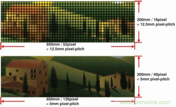 例如,5m視距的系統(tǒng)需要5mm像素間距來(lái)實(shí)現(xiàn)良好分辨率。另一個(gè)視覺(jué)實(shí)例如圖7所示,圖中展示了過(guò)低像素間距如何降低輸出影像質(zhì)量。像素間距為12.5mm 的影像(上)看起來(lái)很粗糙,無(wú)法近距離辨識(shí)。但保持一定的距離觀看時(shí)影像開(kāi)始變得清晰,與觀看像素間距為5mm的影像(下)類似。這個(gè)實(shí)例清楚地說(shuō)明了視距與像素間距的關(guān)系。