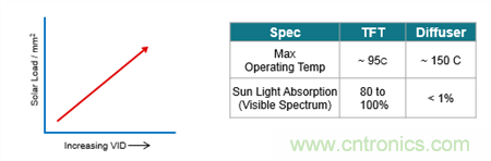 為了更好地理解為什么散射屏具有優(yōu)勢,我們不妨來看看散射屏與傳統(tǒng)TFT面板的物理特性(圖4)。散射屏具有的兩大主要優(yōu)勢在于可在更高的溫度中工作,此外散射屏不會(huì)吸收大量的太陽入射可見光譜,這一點(diǎn)更加重要。(光譜的紅外[IR]和紫外[UV]部分很容易被過濾。)
