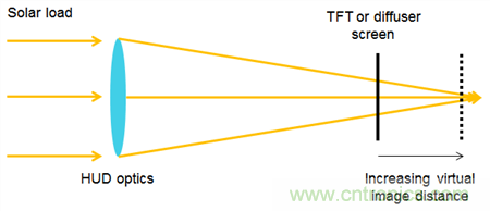 圖 2:HUD光學(xué)器件將太陽能負(fù)載放大到散射屏或薄膜晶體管(TFT)面板上