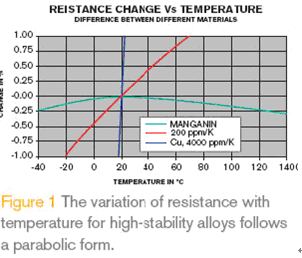 圖1 是錳鎳銅合金電阻的典型溫度特性曲線,溫度系數(shù)TCR單位為ppm/K,在20或25°C 時(shí),TCR=[R(T)-R(T0)]/R(T0) ×(T-T0),對(duì)于溫度系數(shù)的定義,制造商標(biāo)明溫度的上限是必要的,舉例說明在+20 -+60°C的溫度范圍內(nèi),測量系統(tǒng)經(jīng)常選用TCR為幾百個(gè)ppm/K 的低阻值的厚膜電阻器,圖1中紅色曲線表示TCR 為200 ppm/K的電阻器的溫度特性,即使在如此小的范圍內(nèi),+50°C的溫度變化就足以導(dǎo)致阻值變化超過1%,這樣的電阻是不能用于精確電流測量的,有些測量設(shè)備制造商甚至使用PCB走線的銅膜作為電流取樣電阻,銅的TCR是4000 ppm/K(or 0.4%/K),2.5°C的溫度變化就足以造成1%的誤差。