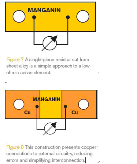 四引線設(shè)計(jì)推薦用于大電流和低阻值應(yīng)用。通常的做法使用錳鎳銅合金帶直接沖壓成電阻器(圖7),但這不是最好的辦法。盡管四引線電阻有利于改進(jìn)溫度特性和熱電壓,但總阻值有時(shí)高出實(shí)際阻值2到3倍,這會(huì)導(dǎo)致難以接受的功率損耗和溫升。此外,電阻材料很難通過螺絲或焊接與銅連接,也會(huì)增加接觸電阻以及造成更大的損耗。