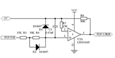 在如圖3所示的同步方波發(fā)生電路中,將工頻電壓同步取樣信號通過電阻 R7 加在運(yùn)算放大器I3的反相輸入端,與同相輸入端的+3V參考電壓進(jìn)行過零比較,那么運(yùn)算放大器的輸出端將得到脈沖寬度符合設(shè)計(jì)要求的方波電壓。