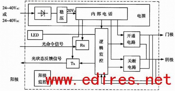 光控接口采用在工業(yè)生產(chǎn)中廣泛使用的標(biāo)準(zhǔn)元器件,它由Agilent技術(shù)生產(chǎn)的HFBR系列,推薦的標(biāo)準(zhǔn)型號光纖是1mm POF(塑料光纖) ,既經(jīng)濟又便于使用。對于超過15m的長距離推薦使用200μm的HCS光纖(硬包層石英光纖) 。光接收器:Agilent HFBR22528型,光輸入功率Poncs>- 21dBm(1 mm POF) , 光噪聲功率Poffcs <- 40dBm,光脈沖寬度門檻tGLITCH≤400ns ,對寬度≤400ns的光信號沒有響應(yīng)。
