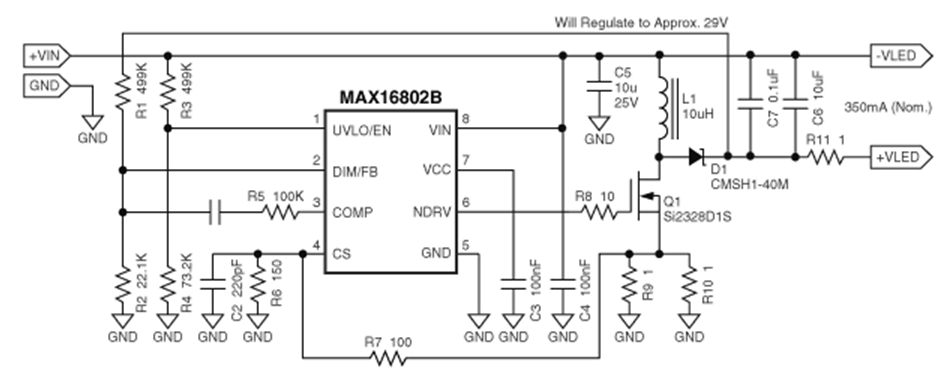 步驟6:R1和R2可選。它們用于調(diào)整+VLED至29V。這在輸出端出現(xiàn)意外開路時(shí)非常有用。如果沒(méi)有上述元件的分壓,輸出電壓有可能上升,導(dǎo)致器件損壞。