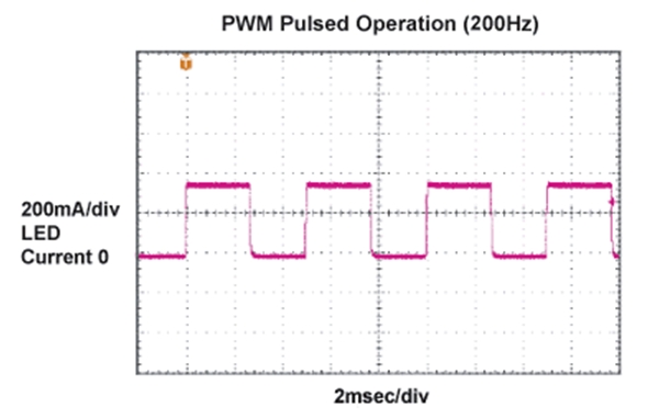 控制LED燈源亮度的最好辦法是通過(guò)一個(gè)低頻PWM脈沖調(diào)制LED電流。使用這種方法,LED電流根據(jù)占空比的變化觸發(fā)脈沖,同時(shí)保持電流幅度恒定。這樣,器件發(fā)出的光波波長(zhǎng)在整個(gè)調(diào)節(jié)范圍內(nèi)保持不變。