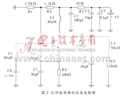 壓控振蕩器(VCO)是鎖相環(huán)路的重要組成部分。隨著電子技術(shù)的發(fā)展,出現(xiàn)了許多集成的VCO芯片。考慮到高頻率穩(wěn)定度、低相噪的要求,這里采用Agilent公司生產(chǎn)的低噪聲晶體管HBFP0450來設(shè)計(jì)VCO。常用的VCO一般有三種:晶體壓控振蕩器、LC壓控振蕩器和RC壓控振蕩器。對于超高頻段的VCO,采用LC振蕩器形式;為了提高頻率穩(wěn)定性,采用了克拉潑電路,并進(jìn)行了相角補(bǔ)償。