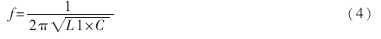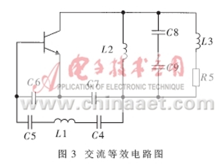 交流等效電路如圖3所示。L1、C4和C5串聯(lián)可以等效成一個(gè)電感,從而滿足電容三端振蕩器的相位條件。L1、C4、C5、C6、C7構(gòu)成了諧振回路,振蕩頻率主要由這五個(gè)元件所決定。頻率計(jì)算公式如下: