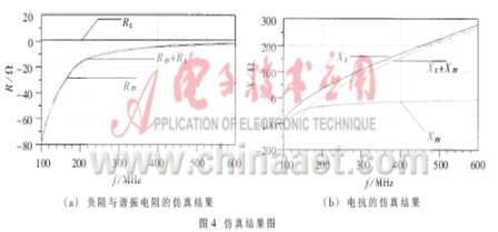 從圖4(a)的仿真結(jié)果可以看出,在200MHz附近,RIN+RL<0,所以滿足起振條件,由于RIN的負(fù)阻比較大,所以提供交流能量的能力比較強(qiáng),故振蕩的幅度會(huì)比較大,這一點(diǎn)在后面的仿真和測試中可以得到證實(shí)。從圖4(b)可以看出,當(dāng)f為200MHz左右時(shí),XIN+XL=0,從而滿足相位平衡條件,它決定了振蕩的頻率。