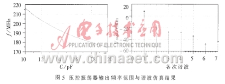 式中,fm為頻偏,KVCO為VCO控制靈敏度,fo為振蕩頻率,Q為品質(zhì)因數(shù),F為晶體管的噪聲系數(shù),K為波爾茲曼常數(shù),T為工作溫度,Ps為振蕩信號功率,fc為閃爍噪聲拐角頻率,Vm為低頻噪聲源的總幅度。從式(5)可以看出,選擇噪聲系數(shù)小的放大管、增加諧振回路有載Q值、減小VCO控制靈敏度、提高輸出信號功率都可以降低相位噪聲。通過減小變?nèi)莨茉谥C振回路中的接入系數(shù),可以有效減小VCO控制靈敏度,但是也會(huì)導(dǎo)致頻率覆蓋范圍的減小,所以要適當(dāng)選擇接入系數(shù)。該VCO輸出頻率為200MHz時(shí),變?nèi)莨芙尤胂禂?shù)為0.63。通過適當(dāng)調(diào)整輸出回路的電感和分壓電容,可以提高負(fù)載阻抗,從而有效地提高輸出功率,以達(dá)到降低相位噪聲的目的。通過軟件仿真,在頻偏10kHz處的輸出相位噪聲為-101.3dBc/Hz,在100kHz處的相位噪聲為-122.5dBc/Hz。