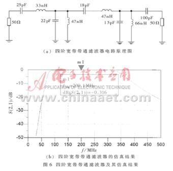 從圖5可以看出,壓控振蕩器的輸出頻率范圍為175MHz~217MHz,基波(頻率為214MHz時(shí))輸出功率為7.911dBm,二次諧波為-16.368dBm,可見有效地抑制了諧波分量。在實(shí)際應(yīng)用中,對諧波濾除的要求比較高,可以在輸出端接入寬帶濾波器,其電路原理圖和仿真結(jié)果見圖6。這樣,可以更有效地濾除高次諧波,同時(shí)有利于輸出匹配,減小負(fù)載對輸出功率的影響。