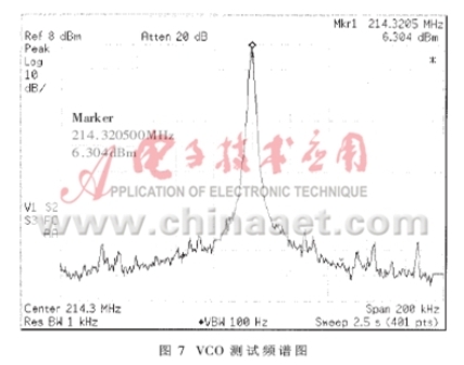 L3和輸出回路的C8、C9、L2可以構(gòu)成等效電感LC,從而進(jìn)行相角補(bǔ)償,使得振蕩器工作在LC回路的諧振頻率上。當(dāng)輸出回路等效為電容時(shí),通過實(shí)際測量,在頻率214.64859MHz上的穩(wěn)定度為9.3631e-4;而等效為電感時(shí),在214.26046MHz上的穩(wěn)定度為4.2278e-4??梢娪玫刃щ姼羞M(jìn)行相角補(bǔ)償后,穩(wěn)定度大約提高了一倍。C8、C9和L2同時(shí)構(gòu)成了輸出網(wǎng)絡(luò),對高次諧波有很好的抑制作用,并使基波輸出功率平坦化。