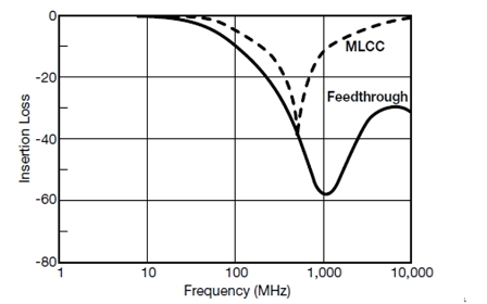 對(duì)于寄生參數(shù)來說,這種幾何結(jié)構(gòu)具有幾個(gè)有趣的問題。首先,電容器的寄生電感要比具有等效電容的相當(dāng)尺寸的片式電容器要小得多??梢詼y(cè)量穿心電容的寄生電感,大約為250pH。該相同的現(xiàn)象是在降低了電感的同時(shí)也降低了ESR(通道長(zhǎng)度,通道長(zhǎng)度,通道長(zhǎng)度!)最后,穿通部分中電感的引入將增加衰減帶寬。圖8給出了一只100pF的穿心電容和一個(gè)等效的標(biāo)準(zhǔn)片式電容之間的插入損耗比較。