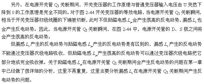 從圖2-45-c以及(2-140)式可以看出,漏感 產生反電動勢的幅度一般都等于或大于輸入電源電壓的幅度,即加到電源開關管D極的電壓最高可達輸入電壓的兩倍,或者更高。這是因為電源開關管的關斷時間一般都很短,而漏感釋放能量時等效負載電阻很大的緣故。因此,如果不對電源開關管采取保護措施,反電動勢很容易就把電源開關管打穿。