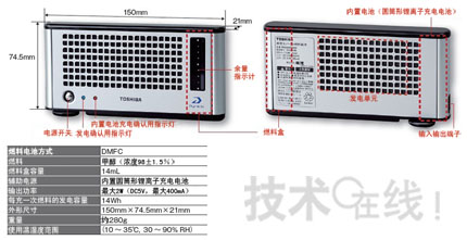 東芝于2009年10月底限量上市了3000塊直接甲醇(DMFC)型燃料電池“Dynario”。該公司自2000年初以來已陸續(xù)發(fā)布多款便攜產(chǎn)品用燃料電池試制品,現(xiàn)在終于上市銷售了。該產(chǎn)品不是由東芝從事手機(jī)及個人電腦等消費(fèi)類電子的業(yè)務(wù)部推出,而是由開發(fā)部件的顯示器部件材料統(tǒng)括部推出,由此可見其中含有試銷因素。