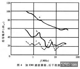 EMI濾波器能有效抑制單片開關(guān)電源的電磁干擾。圖4中曲線a為不加EMI濾波器時開關(guān)電源上0.15MHz~30MHz傳導(dǎo)噪聲的波形(即電磁干擾峰值包絡(luò)線)。曲線b是插入如圖3(d)所示EMI濾波器后的波形,能將電磁干擾衰減50dBμV~70dBμV。顯然,這種EMI濾波器的效果更佳。[page]
