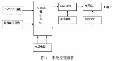 本系統(tǒng)是以AT89S51 單片機為核心控制器,具有電壓可預置、可步進調整、輸出的電 壓信號和預置的電壓信號可同時顯示的數(shù)控直流電源,其硬件原理方框圖如圖1 所示。系統(tǒng) 由AT889S51 控制電路、鍵盤電路、電源電路、D/A 電路、功放電路、短路保護及報警電路、 穩(wěn)壓輸出電路、LED 顯示電路八部分組成。系統(tǒng)通過“開關”、“+”、“-”三個按鍵來控制預置電壓的升降,并通過數(shù)碼管顯示。AT89S51 單片機送出相應的數(shù)字信號,在D/A 轉換之 后輸出電流,經(jīng)集成運放LM358 轉換、三極管放大、RC 網(wǎng)絡濾波,最終穩(wěn)定。同時由LED 數(shù)碼管顯示輸出電壓;由數(shù)字電壓表測量實測值。