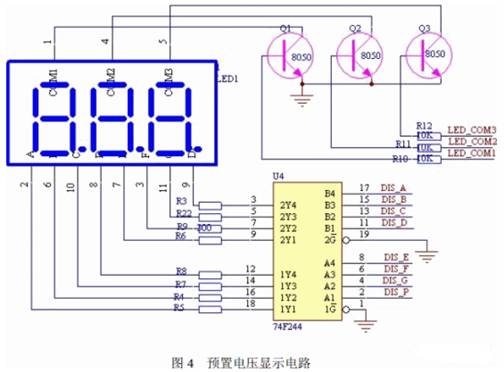預置電壓顯示電路如圖4 所示。本設計選用譯碼驅動器74F244,用來驅動LED 數(shù)碼管 顯示預置電壓,分別由單片機P2.0~P2.7 接口控制。LED 共陰極控制端由P1.4~P1.6 接口 控制,并用三極管8050 來控制LED 的顯示。