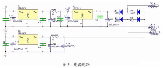 電源部分輸入220V、50Hz 交流電,輸出全機所需的三種電壓:+5V、+15V、-5V,主要供數(shù)控部分和D/A 轉換芯片使用;+15V 作為運放的正電源,同時也是穩(wěn)壓輸出電路的主電源。該電源模塊部分拓展了-5V 負電壓,同時作為運放的負電源,如圖5 所示。