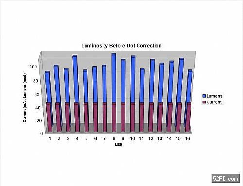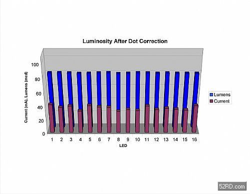 計算和儲存每顆LED的像點修正資料后,再將LED驅(qū)動元件設(shè)定為最大電流,以便單獨調(diào)整每顆LED的電流,如圖2的直方圖所示。只要將像點修正資料存入TLC5940晶片內(nèi)建的EEPROM記憶體,系統(tǒng)就能在每次開機時取出這些像點修正資料,直到下一次重新校準為止。