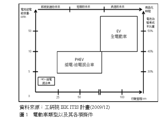 2009年車用鋰電池目前佔整體鋰電池應(yīng)用約1%市場比重很小,使用到電池做為電力系統(tǒng)的電動車型態(tài)包括HEV、PHEV、EV,這三種車輛可行駛的里程以及對於電池容量的要求如圖1。對於電池能量的需求、一次充電後可行駛的里程以及電池組佔整車成本的比重都是EV>PHEV>HEV,當(dāng)然EV是最理想的電動車型態(tài),但是以目前的電池材料技術(shù)尚難以達(dá)到,所以電動車的發(fā)展也仍然必需循序漸進(jìn)的進(jìn)行。由使用電池數(shù)量較少的HEV先用,再逐步擴(kuò)展到EV市場。