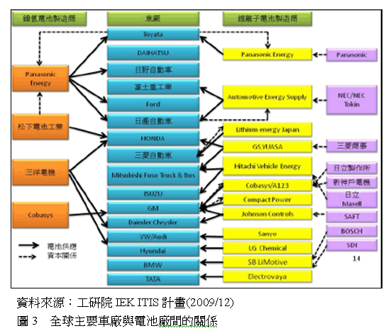 全球車用電池廠商以Sanyo、Cobasys、Panasonic為首,而隨著HEV、PHEV、EV..等話題不斷的吵熱,也吸引越來越多廠商投入市場。當(dāng)前電池芯廠商的家數(shù)相較於全球車廠的家數(shù)少,所以車廠與電池芯廠間如何取得合作關(guān)係以確保電池芯的來源就相當(dāng)重要。當(dāng)前各家車廠與電池芯廠的合作關(guān)係如圖3,當(dāng)前重點的歐美、日系以及韓系的車廠都己有確切的合作結(jié)盟廠商。