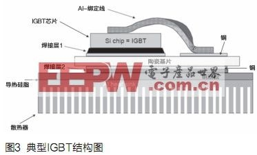 圖3顯示了帶基板的功率模塊的結(jié)構(gòu)。兩側(cè)都帶薄銅層的陶瓷襯底被焊接在基板上。IGBT芯片被焊在設(shè)計(jì)好的銅層上。芯片的表面通過綁定線(bondingwire)壓焊到銅層上。大多數(shù)標(biāo)準(zhǔn)模塊采用這種制作方法。目前70%到80%的功率模塊都按照標(biāo)準(zhǔn)模塊結(jié)構(gòu)來制造。陶瓷一般采用Al2O3,基板采用銅為材料。IGBT底板通過導(dǎo)熱硅脂安裝散熱器。