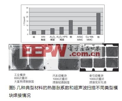 IGBT模塊由多層不同材料組成(見圖3),每種材料具有不同的CTE(熱膨脹系數(shù)),CTE的差別會影響功率模塊的使用壽命,當(dāng)模塊使用時(shí),溫度的變化會在不同層間產(chǎn)生機(jī)械應(yīng)力而導(dǎo)致焊接脫落,我們的目標(biāo)是選用熱膨脹系數(shù)差別盡可能小的材料來進(jìn)行焊接組合。但另一方面,即使它們的熱膨脹系數(shù)十分匹配,因?yàn)椴牧媳旧淼某杀究赡軙?,或者在生產(chǎn)過程中難以被加工或加工成本太高。例如列車牽引應(yīng)用中的AlSiC基板。熱膨脹系數(shù)和襯底幾乎相同,因此有更好的熱循環(huán)特性。但對混合動(dòng)力車應(yīng)用因成本過高而很難被接受。