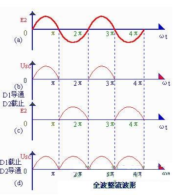這種除去半周、圖下半周的整流方法,叫半波整流。不難看出,半波整說(shuō)是以"犧牲"一半交流為代價(jià)而換取整流效果的,電流利用率很低(計(jì)算表明,整流得出的半波電壓在整個(gè)周期內(nèi)的平均值,即負(fù)載上的直流電壓Usc=0.45e2)因此常用在高電壓、小電流的場(chǎng)合,而在一般無(wú)線電裝置中很少采用。