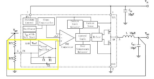 對(duì)于不同廠商設(shè)計(jì)的Buck變換器芯片,外圍電路所需要的器件會(huì)有所不同,這是因?yàn)樾酒募啥扔胁町悾热?,有的廠商會(huì)把功率管集成在芯片內(nèi)部;有的廠商會(huì)把控制部分的補(bǔ)償網(wǎng)絡(luò)集成在芯片內(nèi)部。集成度越高的芯片,外圍電路所需要的器件就越少,因此對(duì)于客戶來(lái)說(shuō),外圍器件的選擇需要根據(jù)具體芯片來(lái)決定。然而,對(duì)于任何一個(gè)輸出可以調(diào)節(jié)的Buck變換器芯片,選擇合適的反饋電阻是必不可少的。圖2是BCD半導(dǎo)體公司的Buck變換器AP3406的典型應(yīng)用圖,由于該芯片集成度很高,外圍只需要輸入電容、輸出電感、輸出電容和反饋電阻,本文就以此為例對(duì)反饋電阻的作用做簡(jiǎn)要分析,為如何選擇反饋電阻提供參考。