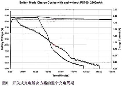 利用開關(guān)式充電解決方案的整個充電周期如圖6所示。通過在充電系統(tǒng)中采用電池監(jiān)控器,可以大大縮短充電周期,使用電池監(jiān)控器就不必再檢測電池包保護(hù)電路兩端的電壓以及充電電流的接觸電阻。