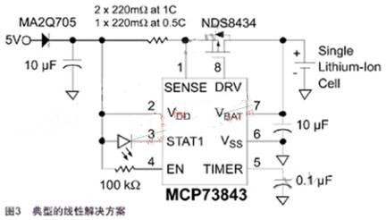 例如,應(yīng)用中需要利用一個5V ±5%的輸入電源以0.5C或1C的恒定電流對一個1000mAh的單節(jié)鋰離子電池充電。圖3顯示了如何利用Microchip的 MCP73843構(gòu)成一個低成本的獨立解決方案,只需要極少量的外部元器件,就可以實現(xiàn)所需要的充電算法。MCP73843完美地結(jié)合了高精度恒流充電、 恒壓穩(wěn)壓以及自動充電終止等功能。