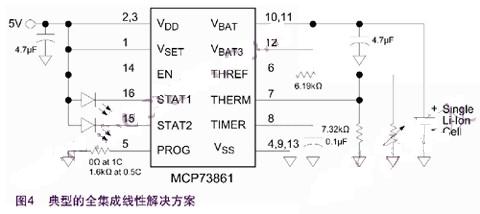 基于Microchip MCP73861的全集成線性解決方案如圖4所示。MCP73861包含了MCP73843的所有功能,另外還包括電流檢測、傳輸晶體管、反向放電保護(hù)以及電池溫度監(jiān)測。
