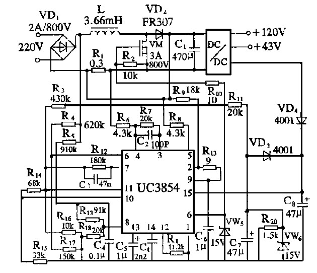 圖4 UC3854 構(gòu)成PFC 電路的大屏幕彩電開關(guān)電源原理圖[page]