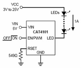 而在要求驅(qū)動大電流的高亮度LED汽車照明應(yīng)用中,可以采用安森美半導(dǎo)體的CAT4101高亮度線性LED驅(qū)動器。CAT4101能驅(qū)動一串電流高達(dá)1 A的高亮度LED,且滿載時的壓降僅為極低的0.5 V。這種簡單方案不要求電感,消除開關(guān)噪聲,將元件數(shù)量減至最少,并簡化設(shè)計,典型應(yīng)用電路如圖5所示。