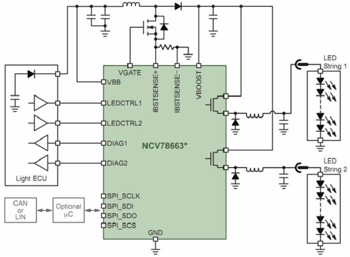 一般而言,汽車前照燈要求支持從單個LED到多串LED,電壓可高達(dá)60 V;此外,還要求支持脈寬調(diào)制(PWM)調(diào)光(如用于示廓燈)、高集成度、高能效、LED串低電磁輻射、集成診斷及通信接口等。安森美半導(dǎo)體針對LED汽車前照燈系統(tǒng)開發(fā)了NCV78663電源鎮(zhèn)流器及雙LED驅(qū)動器。NCV78663是先進(jìn)的高可靠性、高能效的系統(tǒng)級芯片(SoC) LED驅(qū)動器,支持達(dá)2 A電流,提供高于90%的總能效,驅(qū)動高達(dá)60 V電壓的多串LED,能以PWM調(diào)光維持色溫及控制平均電流,使設(shè)計人員能夠以一顆高集成度的SoC控制遠(yuǎn)光燈及近光燈、日間行車燈、轉(zhuǎn)向指示燈及霧燈,所需外部元件極少。這器件通過SPI接口與外部微控制器通信,在上電后動態(tài)地控制系統(tǒng)參數(shù)、檢測LED工作狀態(tài)并反饋診斷信息。圖8顯示的是NCV78663在先進(jìn)的汽車前照燈應(yīng)用中的電路圖。