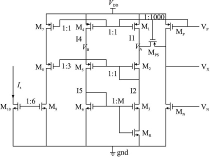 圖2所示電流檢測電路中, MP、MN 為功率管,M1 與M4、M2 與M5 的W/L相同, VP 為MP 的控制信號, MPS用作開關, 其W/L比較大, 具有低導通電阻。在電流模DC /DC 轉換器中, 反饋控制環(huán)路只需檢測MP 功率管導通時的電流, 因此, 為降低功耗, 可控制電流檢測電路只在MP 功率管導通時工作, 即只檢測電感充電階段的電流, 而在MP 功率管截止時, 電流檢測電路不工作, 進而有效地減小了功率損耗。