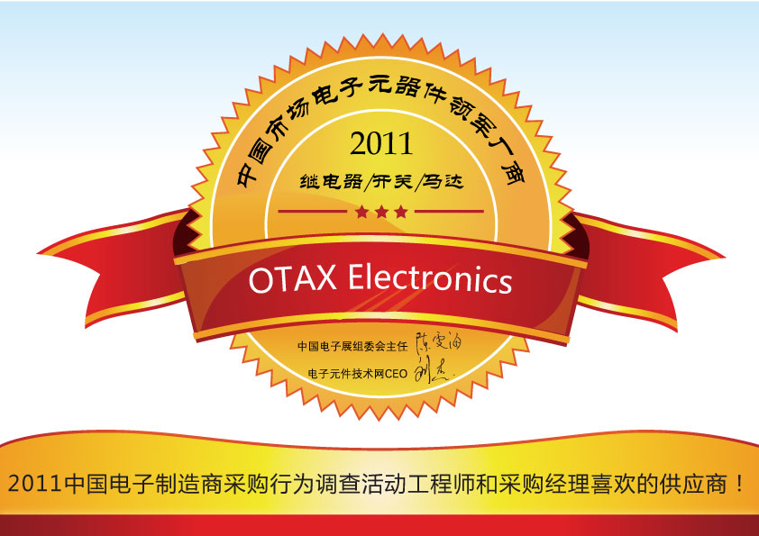 在近日剛剛結束的2011中國電子制造商采購行為調查暨中國市場電子元器件領軍廠商的評選活動中,OTAX Electronics憑借持續(xù)穩(wěn)定的產(chǎn)品、技術和服務等多方面優(yōu)勢,以及在工程師心目中形成的良好形象,一舉榮獲2011中國市場電子元器件(繼電器/開關/馬達類)領軍廠商稱號!
