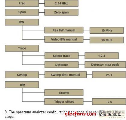 正如已經(jīng)提到的一樣,頻譜分析器在“零檔”模式下使用。不論是分辨率帶寬還是視頻帶寬,均設(shè)為10MHz,因為頻譜分析器被用來測量峰值功率?;谕瑯拥睦碛桑瑱z測器必須在“最大峰值”模式下設(shè)置。選取25s的掃描時間以便獲得對屏幕的整體掃描。選擇外部觸發(fā)器的可選項。利用“觸發(fā)器偏差”特性將屏幕上的軌跡置于中心也是一種明智的選擇。-2s即是合適的。圖3顯示了詳細(xì)的配置序列。