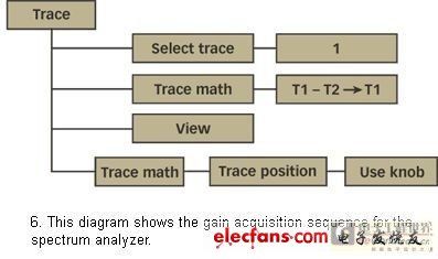 用于頻譜分析器的功能序列顯示在圖6中。線跡1設(shè)定為計算“線跡1”減去“線跡2”,后者包含了輸入功率。這樣,新獲取的輸出功率將提供一個以dB為單位的增益圖。“線跡位置”特征被用作獲得直接讀取以dB為單位的絕對增益的一個偏差。線跡偏差被設(shè)置為“輸出偏差”減去“輸入偏差”。這種情況下,“輸入偏差”在校準(zhǔn)階段被確定為30.7dB,結(jié)果得到偏差值為13dB。該值不能直接作為以dBm為單位的偏差值加入,因為“線跡位置”清單只接受作為Y刻度百分比的輸入。旋轉(zhuǎn)鈕用來獲取與13dB偏差值相對應(yīng)的正確百分比。圖7中的藍線即為所得。