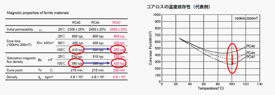 PC47在100℃的磁芯損耗相比PC40降低了約40%