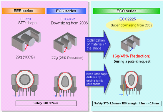 活用高性能材質(zhì)的優(yōu)點(diǎn),以EER28市面上最常用的一種變壓器型號(hào)分析。由于密度更大,我們可以使變壓器更輕、更小。比如在同樣功率的情況下,用高性能材質(zhì)體積和重量會(huì)比普通材質(zhì)更小。這邊僅以EER28為例,我們將以ECO2225系列可以取代市場(chǎng)上的EER28,重量有45%的消減。
