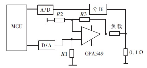 在該電源系統(tǒng)中, 主要為負載提供大電流, 采用PID 控制算法控制負載的發(fā)光強度。輸入為單片機經(jīng)DAC輸出的控制電壓, 一路為比例放大電路, 如圖1 所示增益G=1+R3/R2.電流型DAC 通過R1 轉(zhuǎn)換成電壓, 控制OPA549 .輸出電流經(jīng)采樣電阻轉(zhuǎn)換為采樣電壓, 送入A/D 轉(zhuǎn)換器反饋至單片機進行偏差值補償。