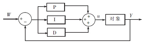 PID 控制原理如圖2 所示。PID 控制是一種線性調(diào)節(jié)器, 它把設(shè)定值W 與實際輸出值相減, 得到控制偏差e .偏差值e 經(jīng)比例、積分、微分后通過線性組合構(gòu)成控制量U, 對對象進行控制。其中比例調(diào)節(jié)器起到基礎(chǔ)調(diào)節(jié)作用, 主要對控制系統(tǒng)的靈敏度和控制速度有影響。積分調(diào)節(jié)器可以自動調(diào)節(jié)控制量, 消除穩(wěn)態(tài)誤差,使系統(tǒng)趨于穩(wěn)定。微分調(diào)節(jié)器可以減小超調(diào), 克服振蕩, 同時加快系統(tǒng)的穩(wěn)定速度, 縮短調(diào)整時間, 從而改善系統(tǒng)的動態(tài)性能。