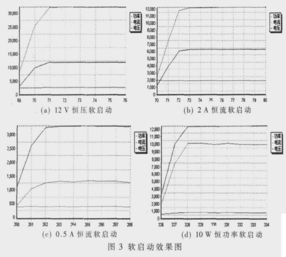 從圖3 的軟啟動效果圖可以看出, 在恒定電壓、電流、功率的模式下工作時, 系統(tǒng)開機過程超調(diào)量很小, 有效地控制了啟動過程, 防止了啟動過程產(chǎn)生過大的擾動電壓, 產(chǎn)生過大的功率, 有效地保護了負載。