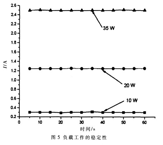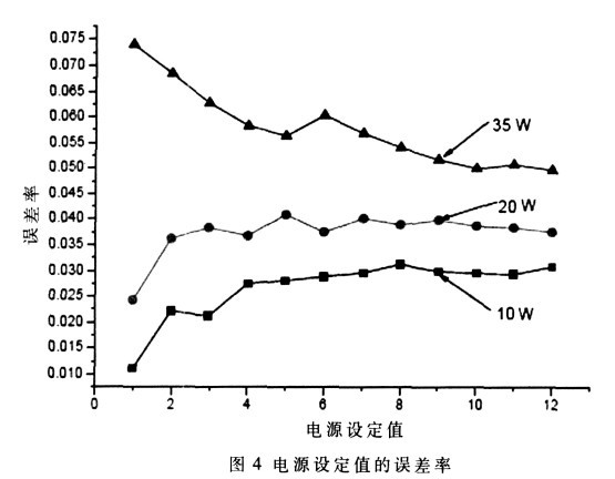 由于輸出電流達到8 A, 對電源的功率要求較高, 易產(chǎn)生噪聲, 這種隨機噪聲也會對輸出電流產(chǎn)生一定的影響。為減弱這種噪聲, 各個模塊分別供電, 以減少交叉干擾, 同時在電路板上多加裝去耦濾波電容, 減小干擾的影響, 同時OPA549 能有效地抑制紋波。影響電源穩(wěn)定性的因素很多, 如負載的變化、取樣電阻的變化、A/D、D/A 的影響等。如圖4 所示, 不同負載的情況下, 電源誤差不同。10 W 的負載, 由于功率較低, 在電壓、電流增加時, 誤差變化也較小。35 W 的負載, 由于功率較大, 工作電流的變化范圍比較大, 功耗較大, 電源的誤差變化相應(yīng)地也比較大。如圖5, 在10 W、20 W 和35 W 的負載時, 工作狀態(tài)穩(wěn)定, 能夠滿足大電流、大功率的需要。
