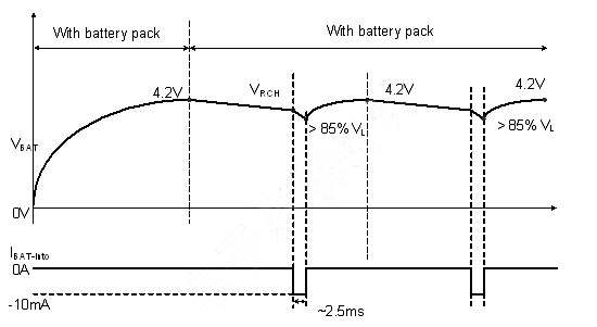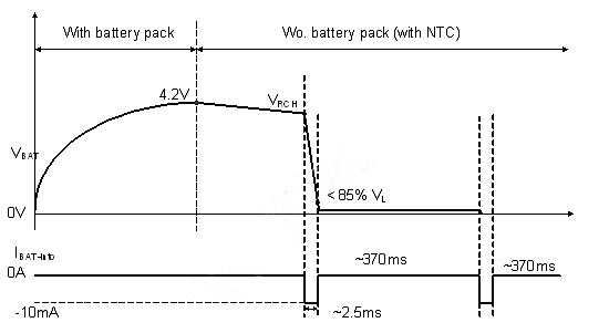 使用者亦有可能在充電或式充電完畢后,在未將電源移除的情況下,即抽離電池的情況。為避免造成危險,IC內(nèi)部應(yīng)具有如圖7, 8的電池存在偵測機制。充電IC會以短時間脈沖(每370ms產(chǎn)生2ms的脈沖)方式抽取電池電流,此時若電池存在,則偵測到的電池電壓應(yīng)大于一預設(shè)閥值;若電池已切離,則充電IC偵測到一低電壓,即可判定為電池斷開狀態(tài),并將電池端電壓切斷,保護使用者安全。