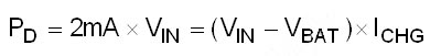 假設(shè)使用5.5V電源供應(yīng)器對單顆1200mAh鋰離子電池進行充電,在0.7°C快速充電電流時,且電池電壓為3V的條件下,可以預估IC運作的最大耗電量為,1.762W的耗電最大值,此一功耗會使得熱阻抗60°C /W的3×3毫米QFN封裝溫度溫升127°C,即便環(huán)境溫度0°C時,也已經(jīng)超過所允許的125°C硅晶片操作溫度最大值。若設(shè)定充電電流為0.6A(0.5C),則可降低IC溫升為90度,可以操作于35度的環(huán)境溫度中,因此是較佳的設(shè)定電流。