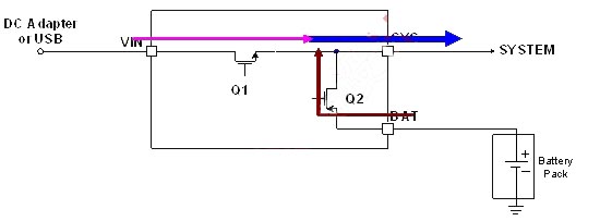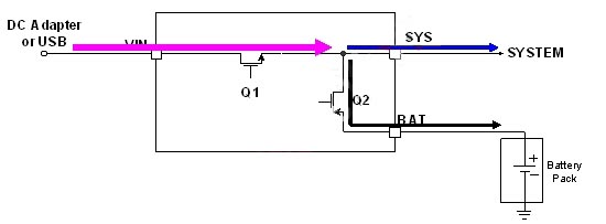 LD6275具有適應(yīng)性電源路徑管理(Adaptable Power Path Management, APPM)功能,其為以供給系統(tǒng)端用電為主,對電池充電為輔,如圖3所示;當系統(tǒng)用電超過輸入電源的供給限制時,其電池亦能主動開啟放電功能同時對系統(tǒng)端供給其所需之電能需求,如圖4所示。
