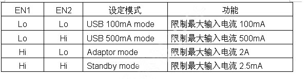 LD6275將電源適配器/USB埠的5V直流電源進行降壓穩(wěn)流,對鋰離子電池進行充電,為防止電源適配器的過電流超載,可以外部電阻RCISET設(shè)定最大充電電流限制。同時支援電腦USB埠充電模式,并依據(jù)外部腳位EN1與EN2進行設(shè)定,各模式請見表1.透過為USB 500mA與USB 100mA操作模式設(shè)定,可以保護PC端USB埠避免過載。